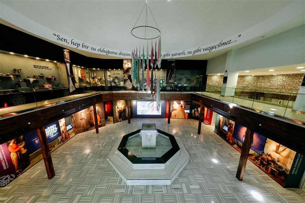 Üç katlı müzenin giriş katı, hamam mimarisinde camekan (soğukluk) alanını temsil etmekte olup kubbenin altında dört yanında aslan başı bulunan bir süs havuzu yer almaktadır.