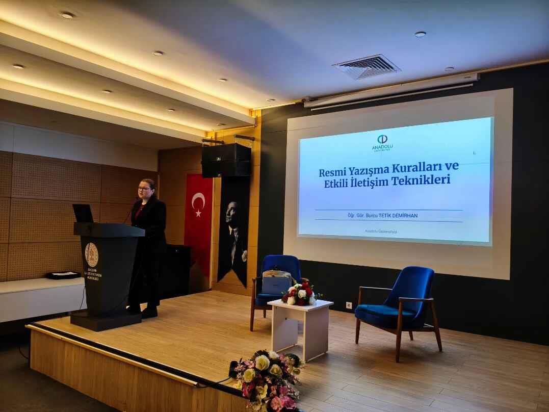 Bu çerçevede, Anadolu Üniversitesi Öğretim Görevlisi Burcu Tetik Demirhan tarafından personelimize "Resmi Yazışma ve Yazım Kuralları Eğitimi" verilmiştir.